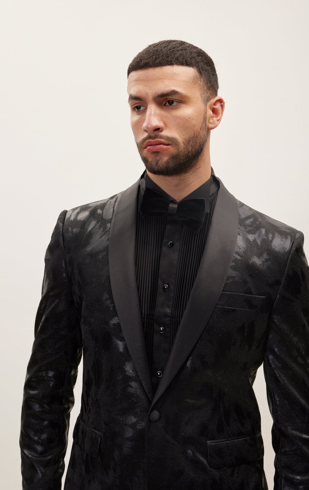 The foil brush strokes detailing adds a touch of artistic flair to the ensemble, creating a visual masterpiece that sets you apart at any formal occasion. The dynamic patterns offer a modern interpretation of classic design, making this tuxedo a standout choice.