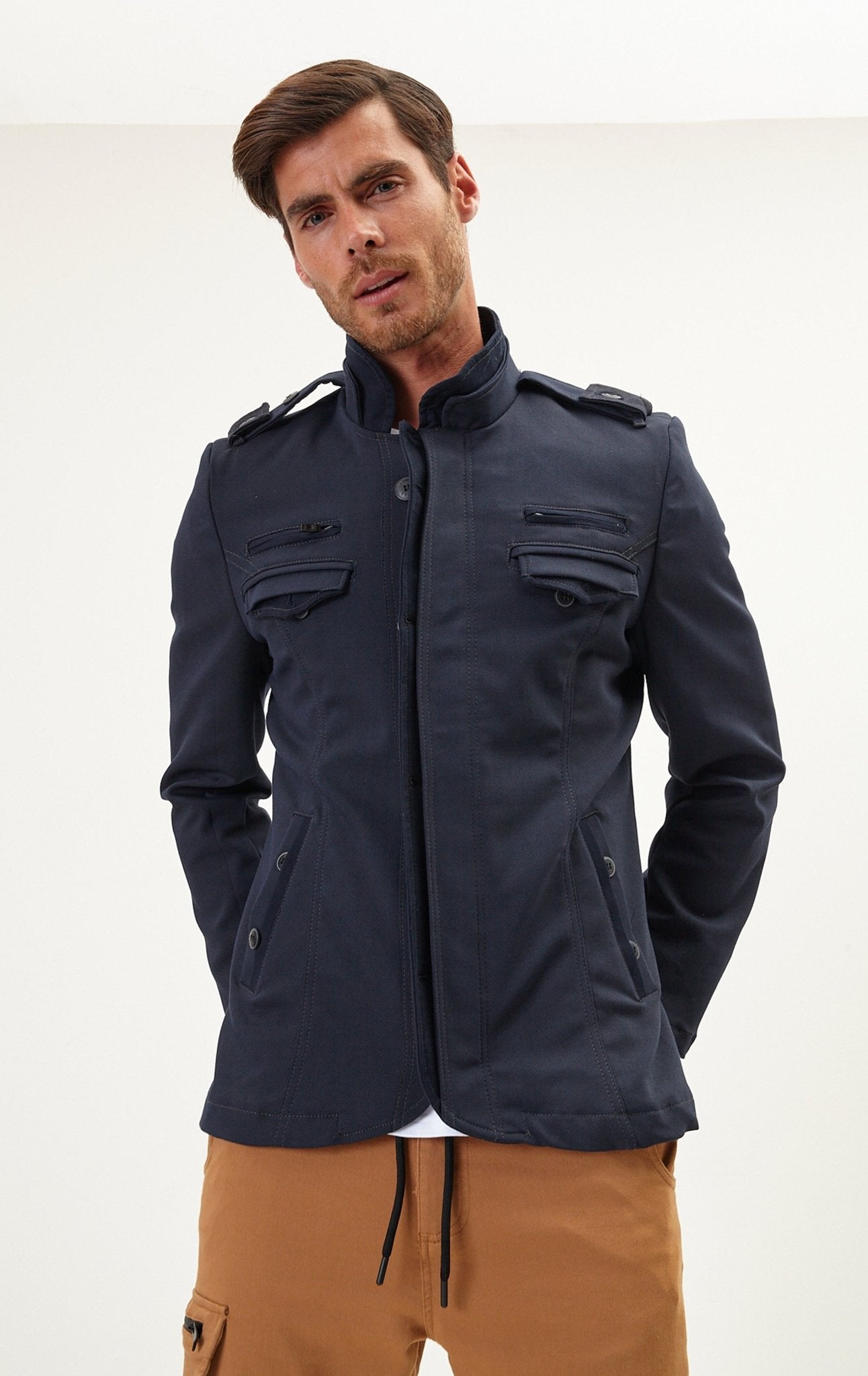Epaulette Shoulder Stand Collar Jacket - Navy