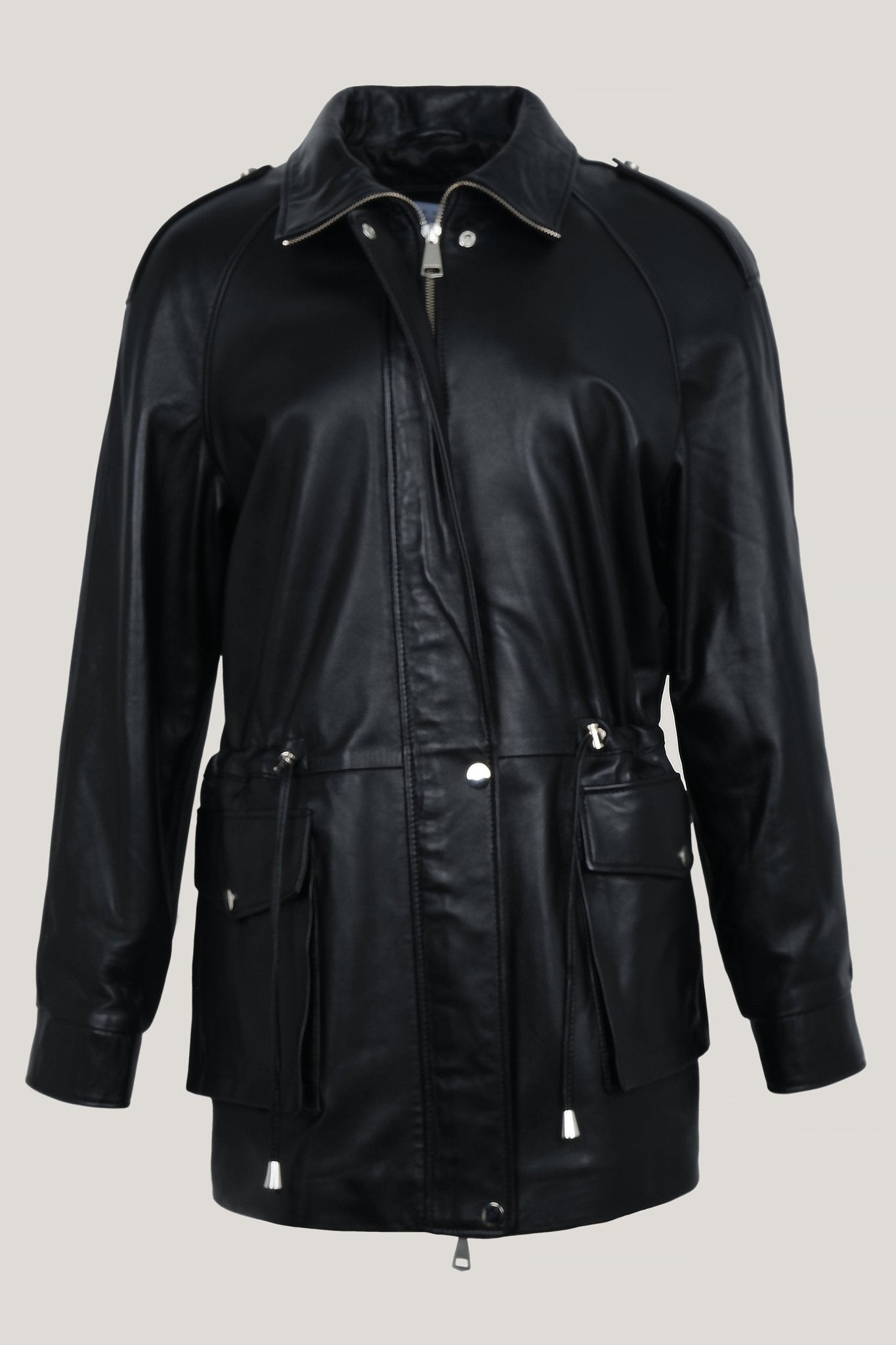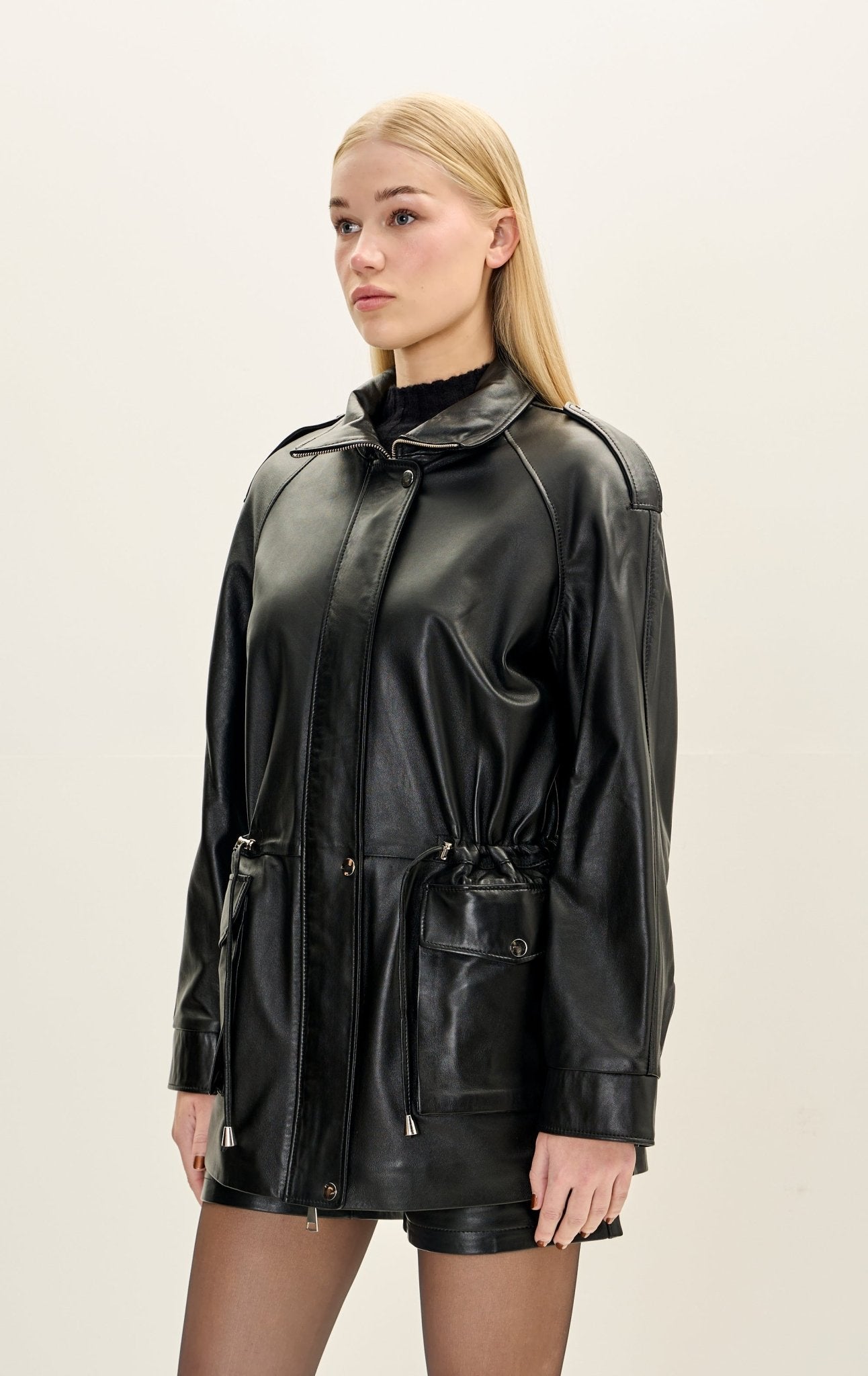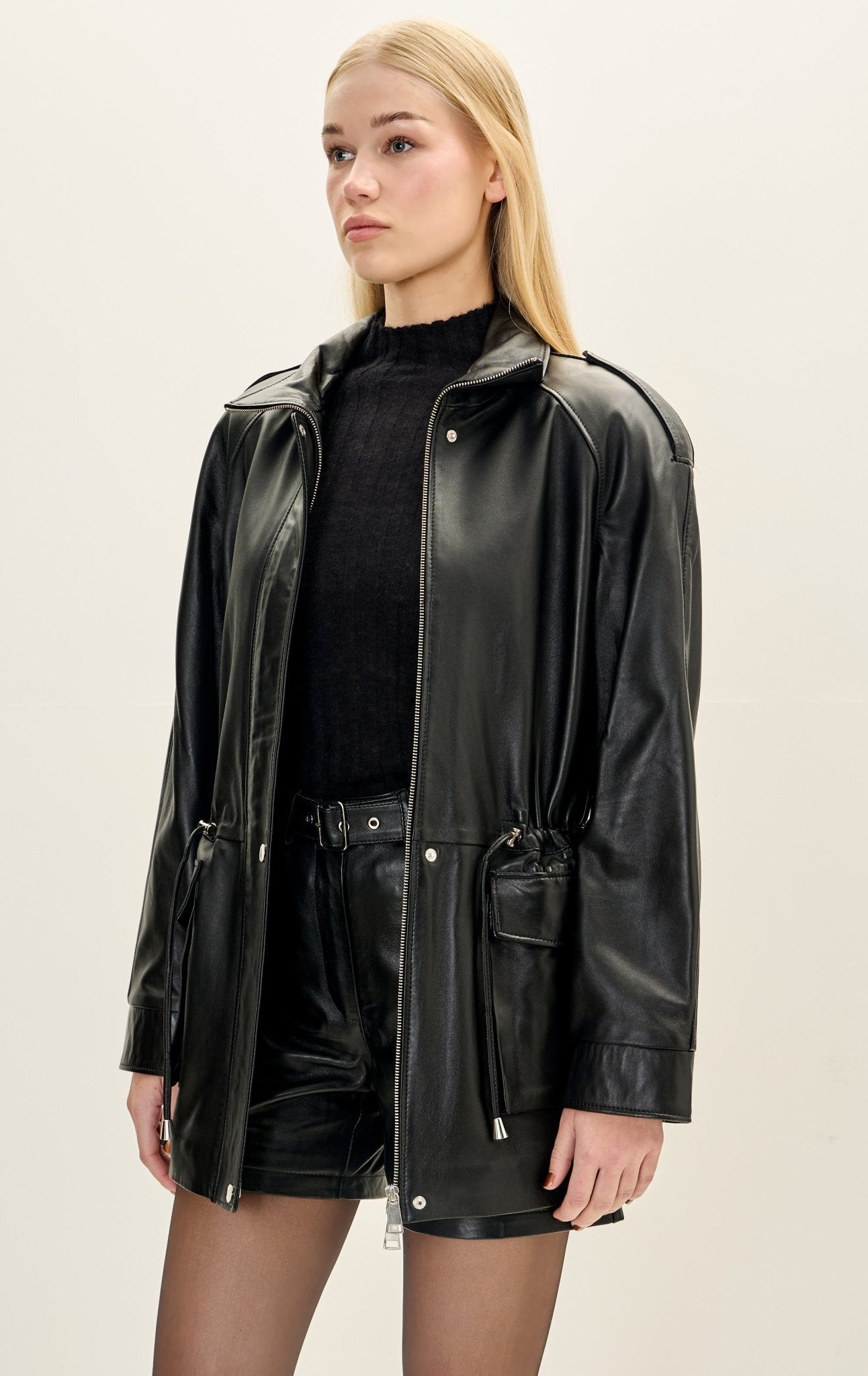 Our detail oriented take on the traditional safari jacket silhouette will be your ultimate throw-on-and-go wardrobe piece. Crafted from premium lambskin leather, it features utility pockets, hidden placket zipper closure, silver contrast button and adjustable waist. The versatile neck design enables a full stand collar or notch lapel options. Just parfait!