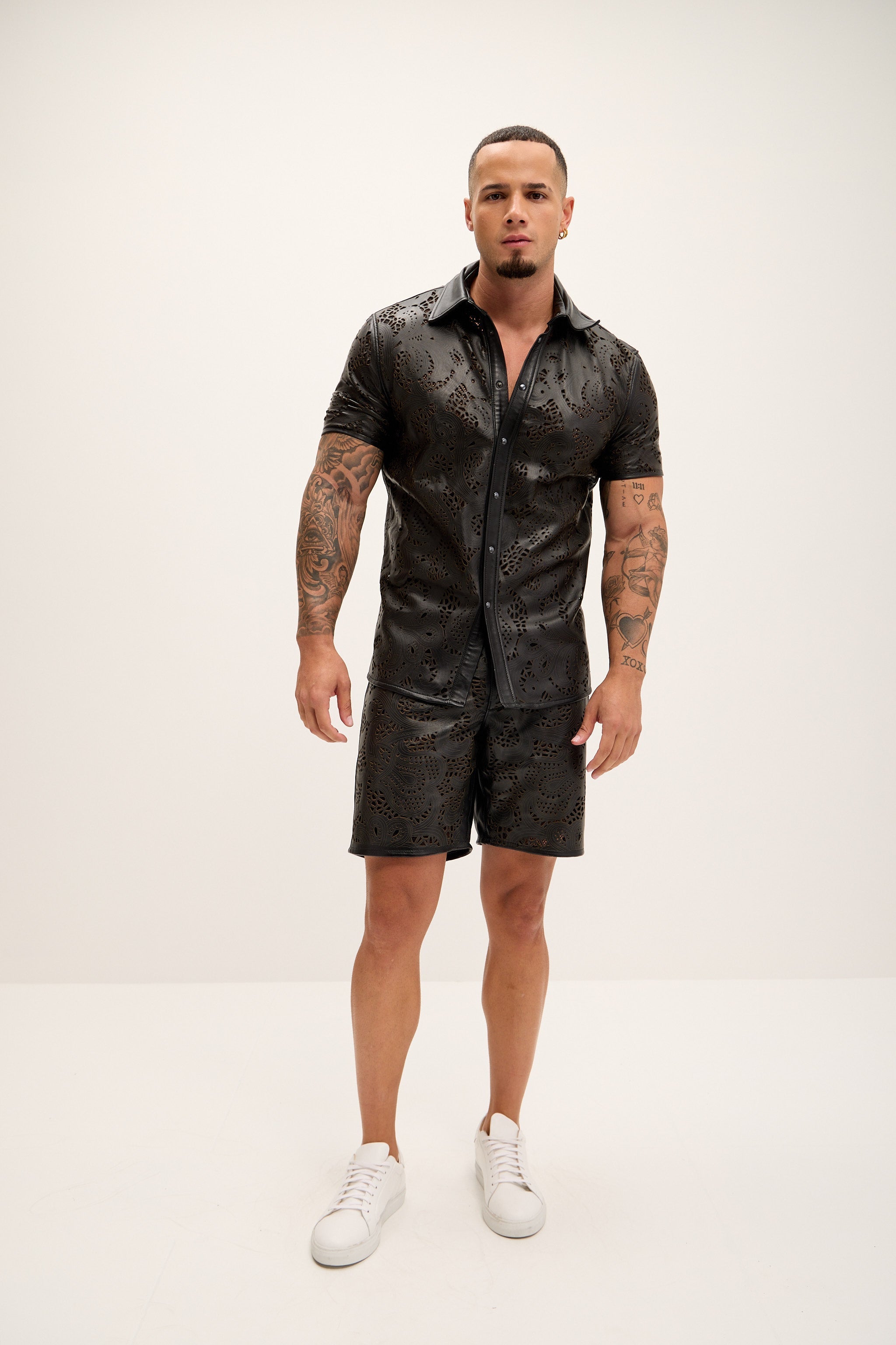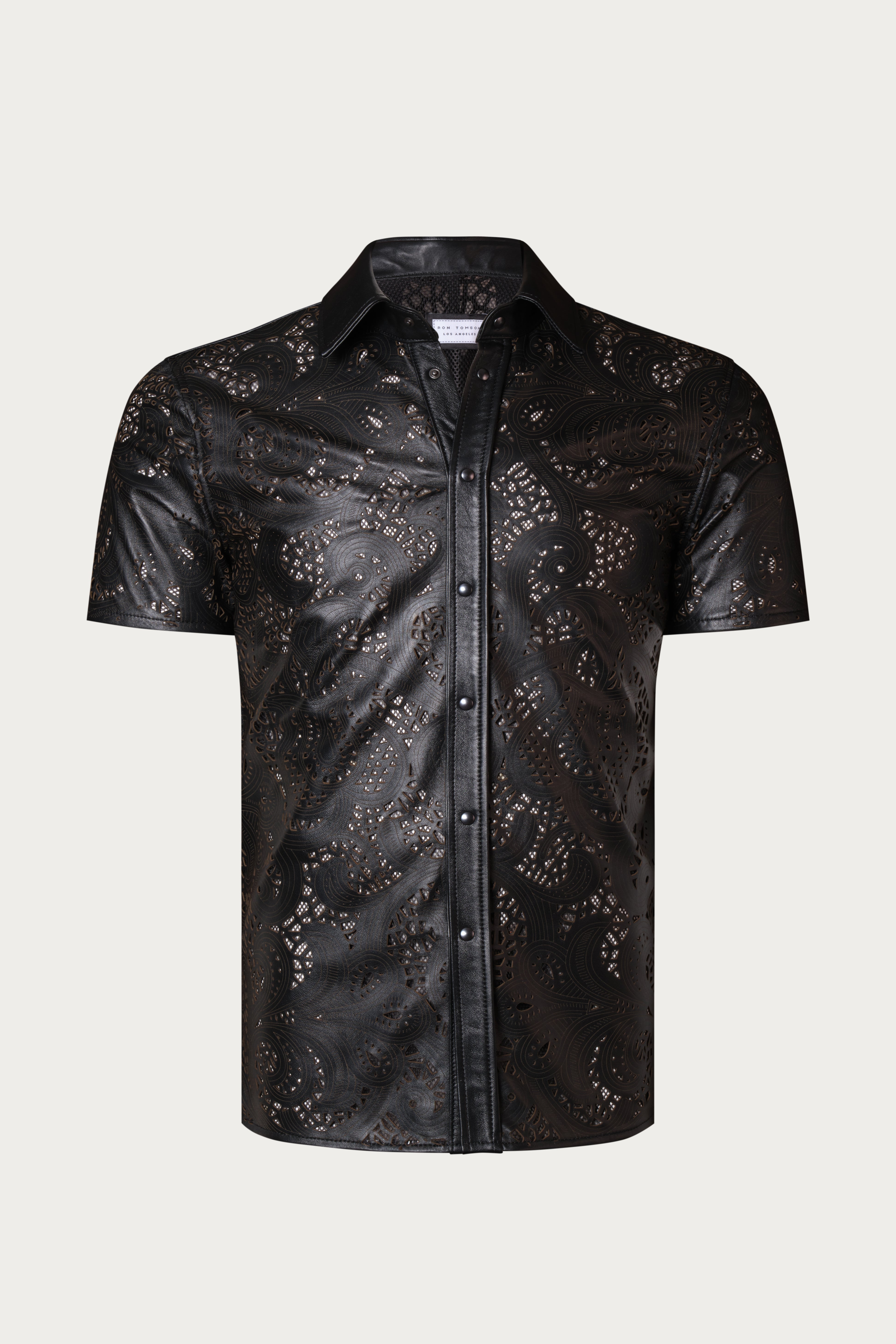 Genuine leather shirt with allover cut-out design. Fully see-through and unlined. Fitted construction. Allover stitching throughout the pointy Italian collar and the placket. Snap button closure. Matching shorts available, Style #2783. Reach out for other colors, which will be available online soon. Made in Turkey100% Genuine Premium Leather Style #4987