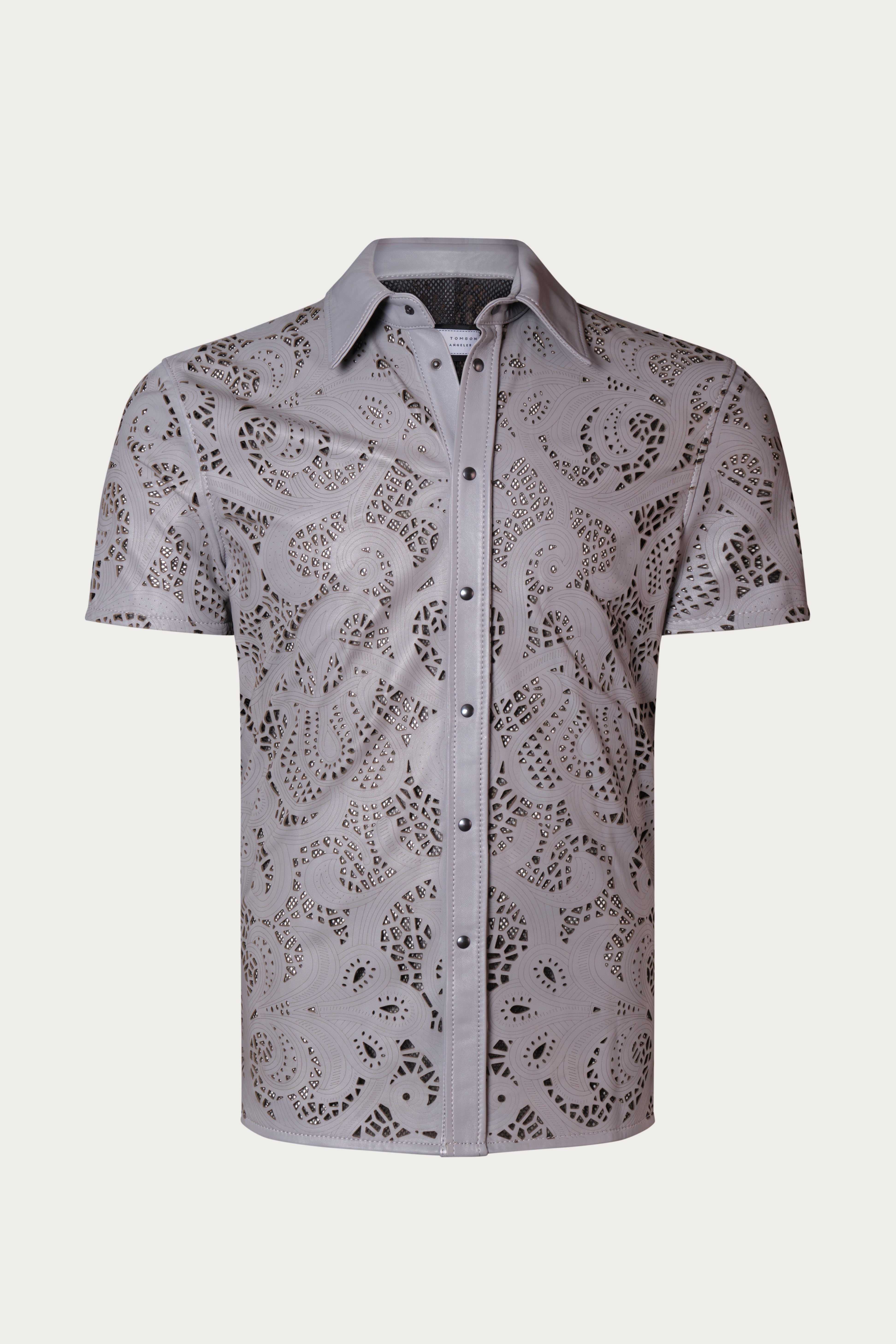 Genuine leather shirt with allover cut-out design. Fully see-through and unlined. Fitted construction. Allover stitching throughout the pointy Italian collar and the placket. Snap button closure.