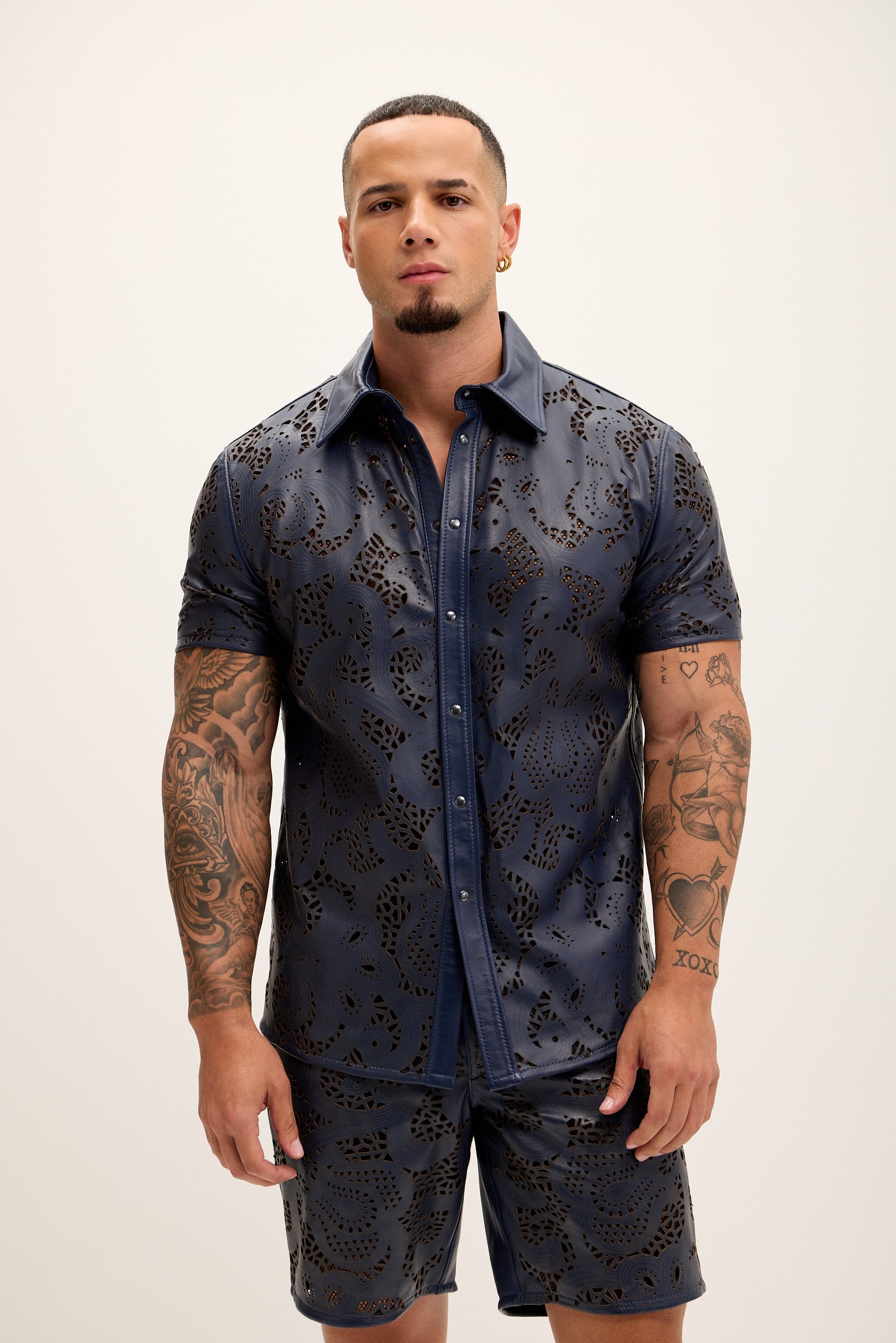 Genuine leather shirt with allover cut-out design. Fully see-through and unlined. Fitted construction. Allover stitching throughout the pointy Italian collar and the placket. Snap button closure. Matching shorts available, Style #2783. Reach out for other colors, which will be available online soon. Made in Turkey100% Genuine Premium Leather Style #4987