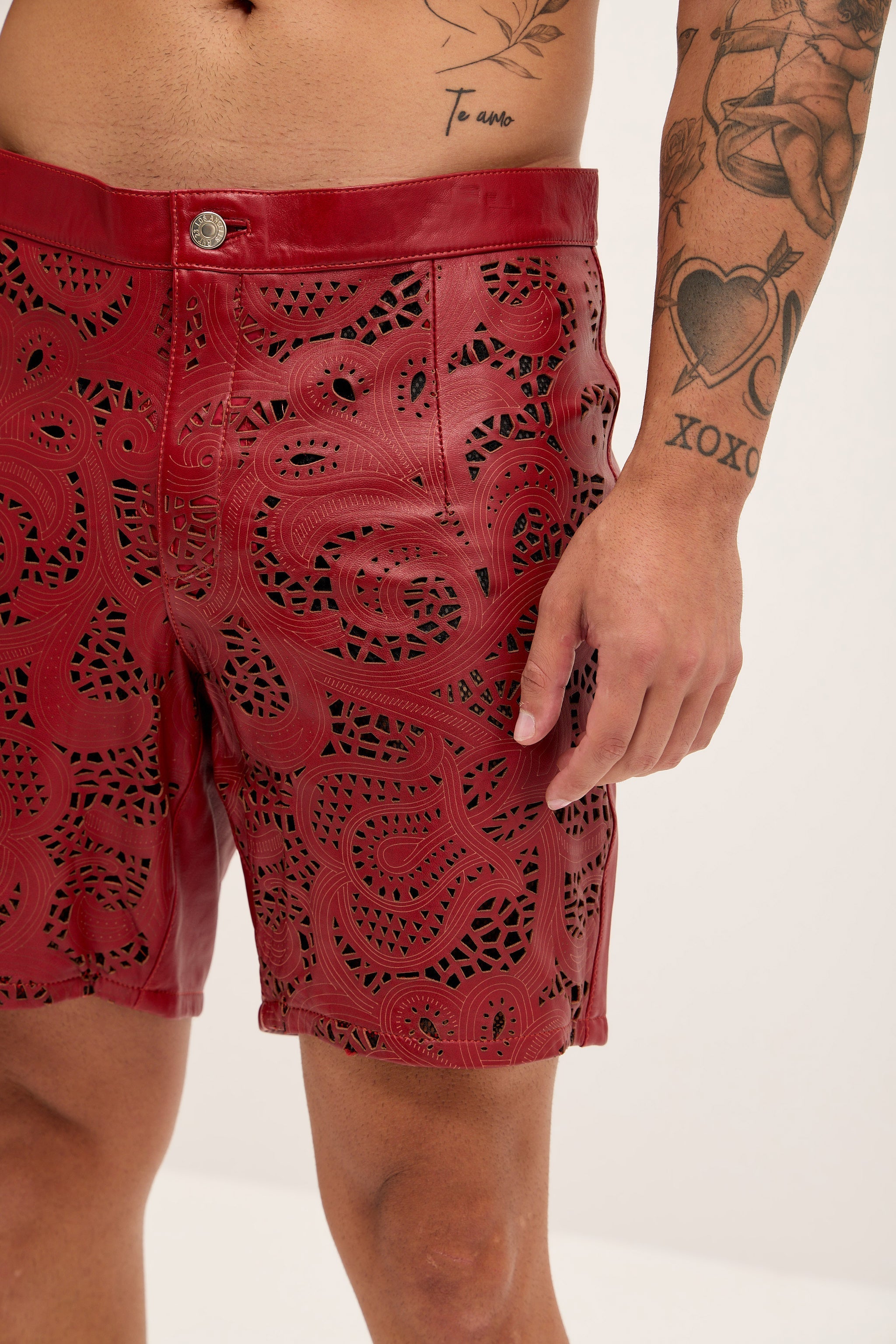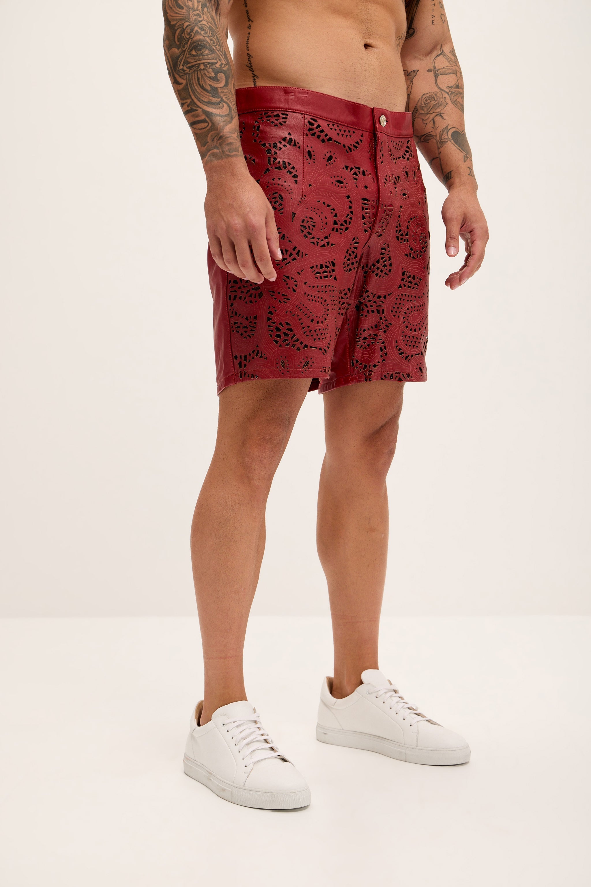 Cut-out Fitted Leather Shorts - Red