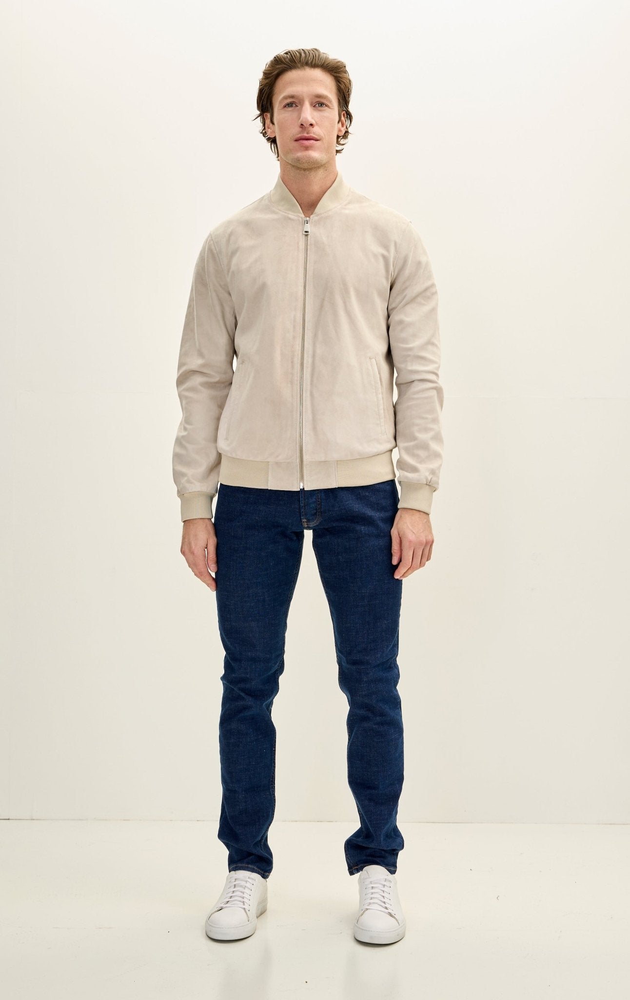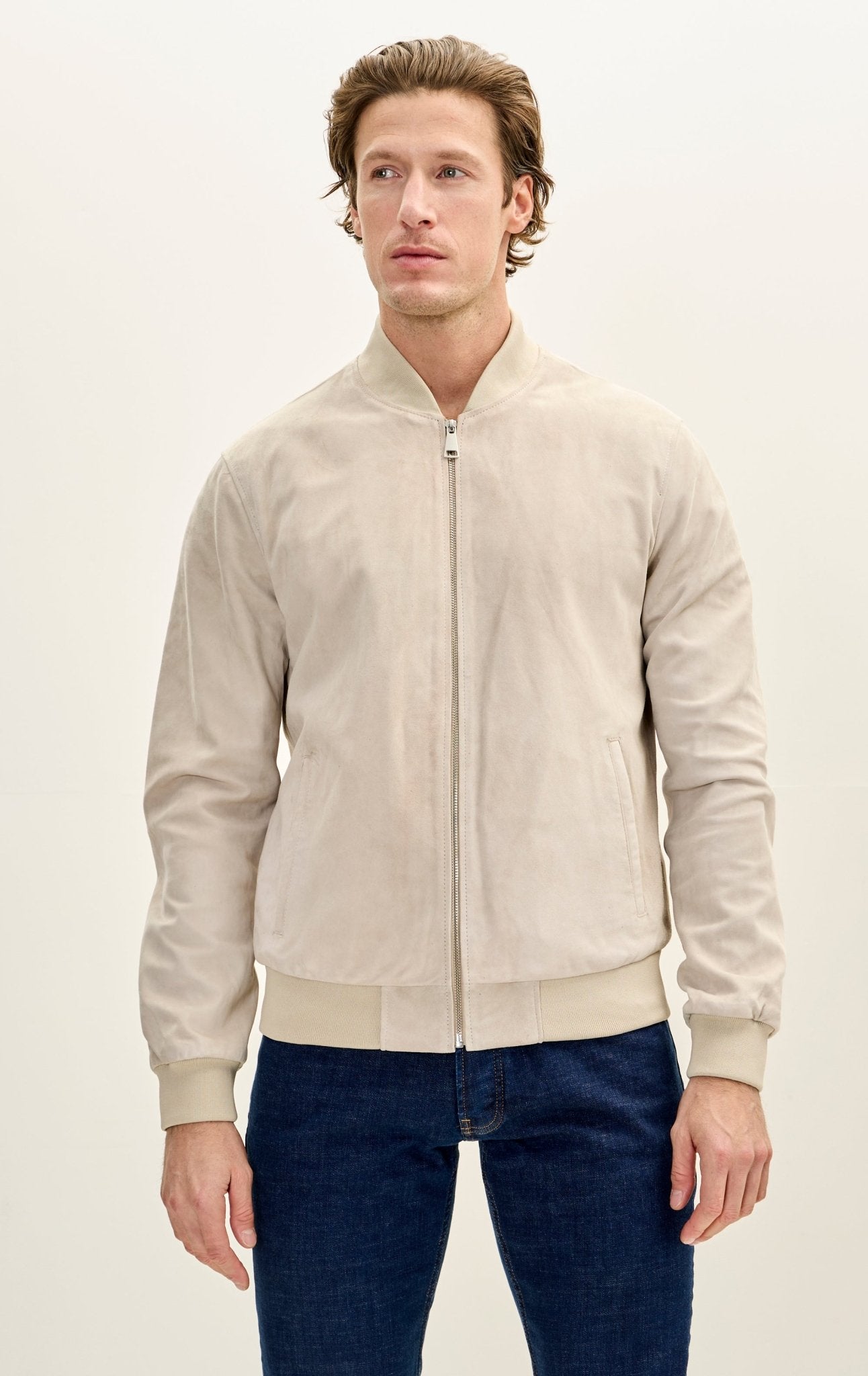 Classic Suede Leather Bomber Jacket - Beige