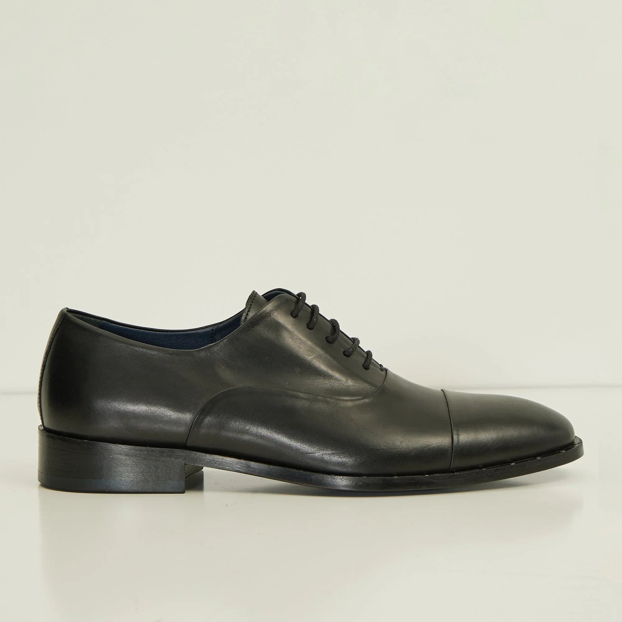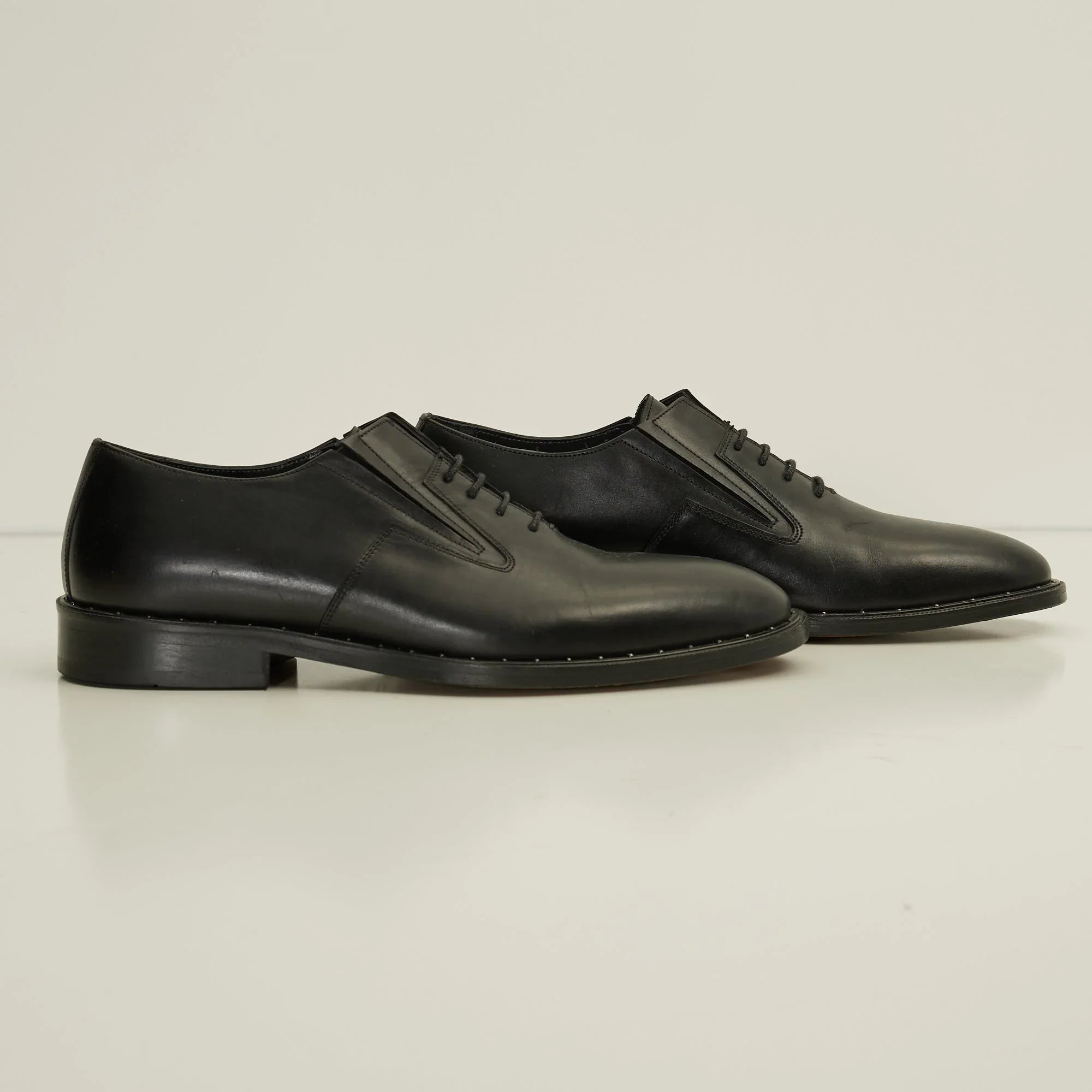 Lace plain toe oxford leather shoe. Calfskin leather upper, elastic bands on the inner facing, and studded details on the welt. Stacked heel. Leather Lining for a luxurious feel and moisture control Leather sole  Tapered round toe. Slip-on Style The handmade leather outsole and insole are Made in Italy. #N°  D4451