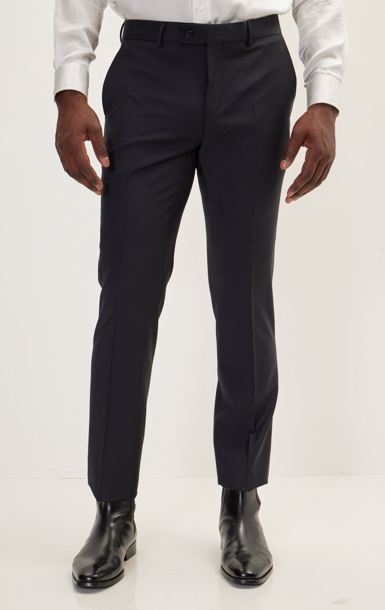 Ron Tomson suits and tuxedos are Drop 8, which means there is an eight-inch difference between the chest and the waist. For example, if your chest size is 38 inches, your suit will come with 30-inch waist pants. If you are in-between sizes, we recommend getting a larger size and tailoring down (if necessary). Our suits have a tailored fit, which requires minimal tailoring(if any).