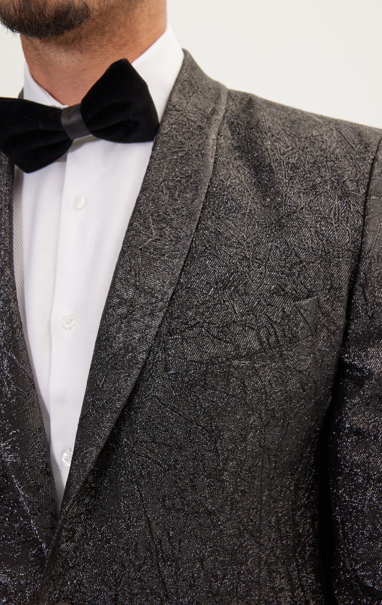 Step into the limelight at formal affairs, redefine your style, and make a lasting impression with the Bump Crack Texture Fabric Black Pleated Fabric Metallic Shimmer Tuxedo Jacket. Command attention with this distinguished and unforgettable ensemble that seamlessly fuses classic craftsmanship with contemporary and expressive design. Pair with any Tomson Tuxedo Pants
