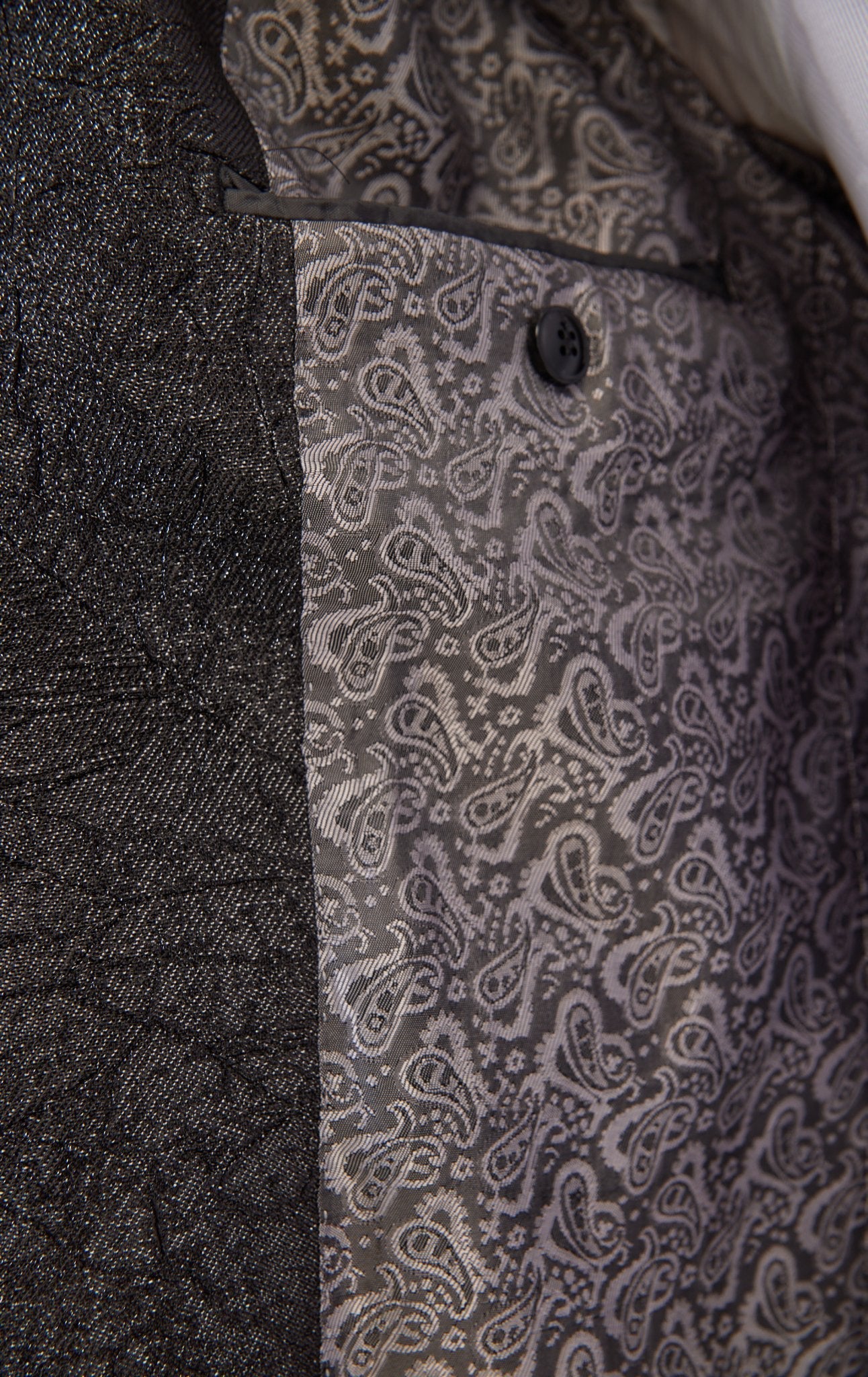 Elevate your formal look with the Crack Texture Pleated Metallic Tuxedo Jacket by Ron Tomson. Meticulously crafted, this jacket is a captivating fusion of classic sophistication and contemporary allure, designed to make a bold statement at any formal occasion.