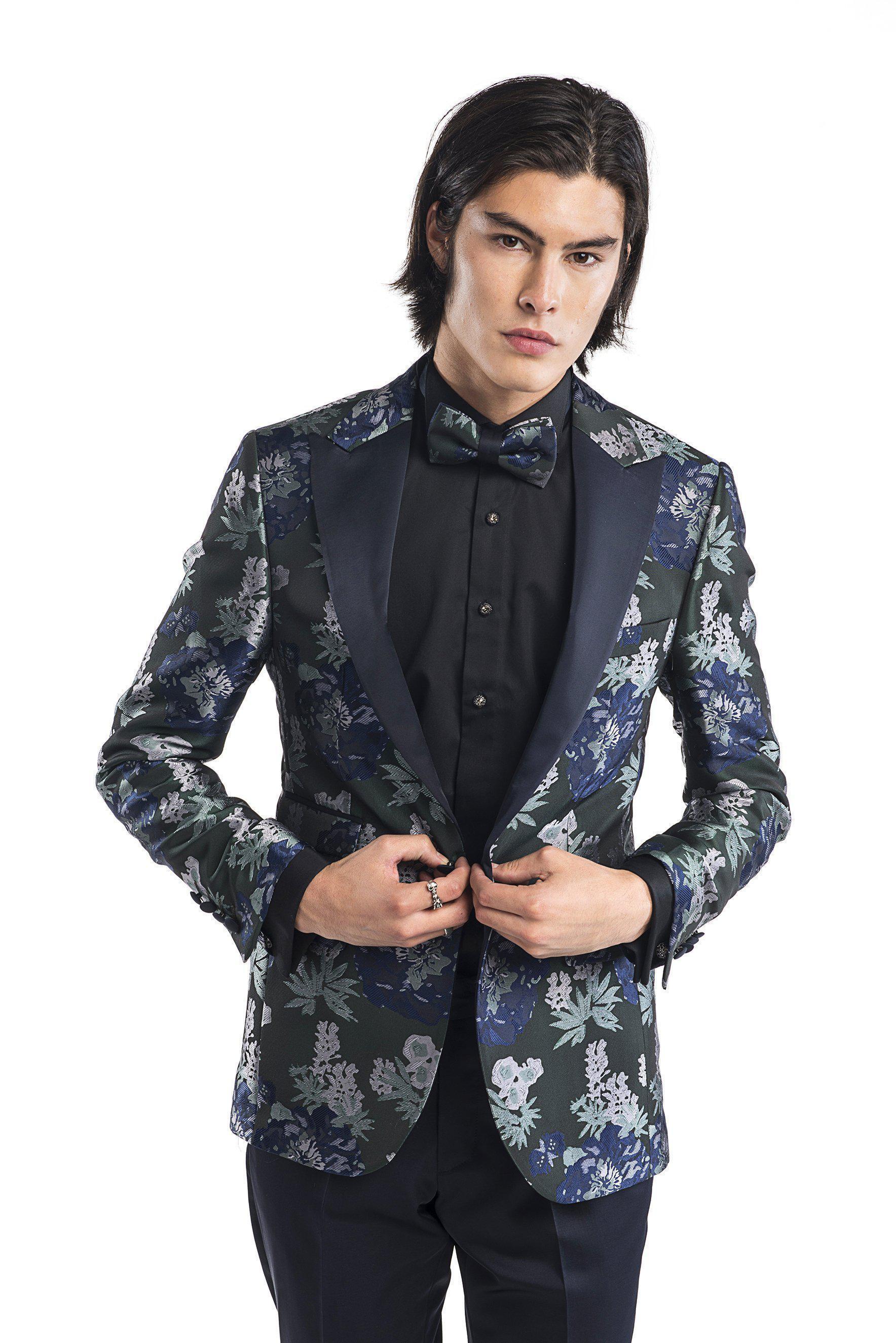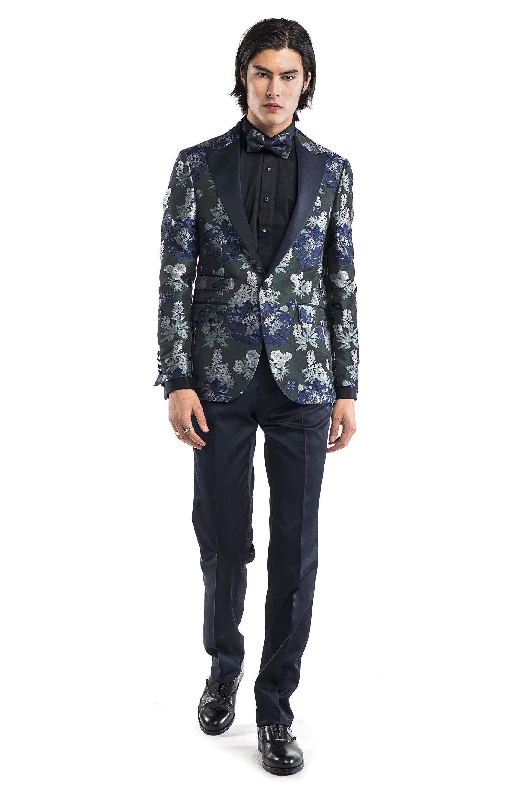 Contrast Peak Lapel All Over Floral Tuxedo - Navy Green