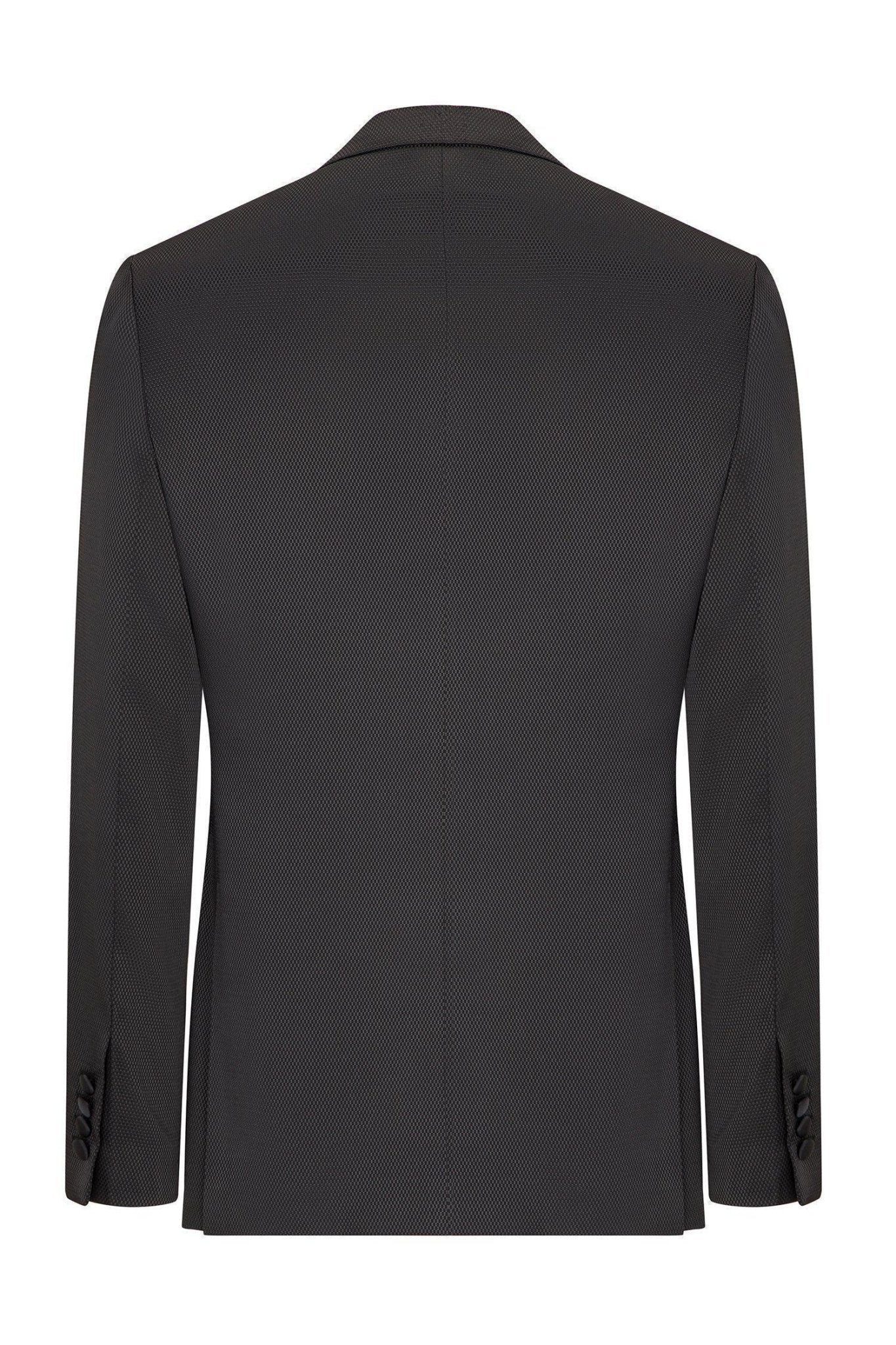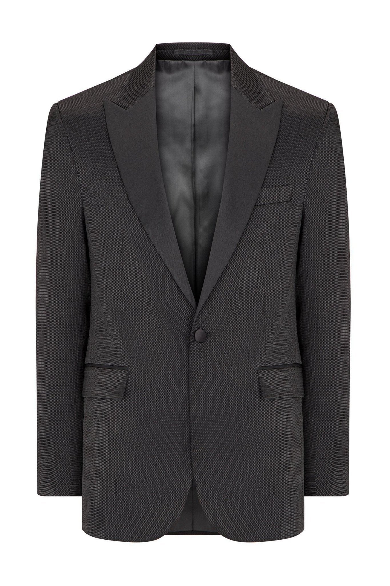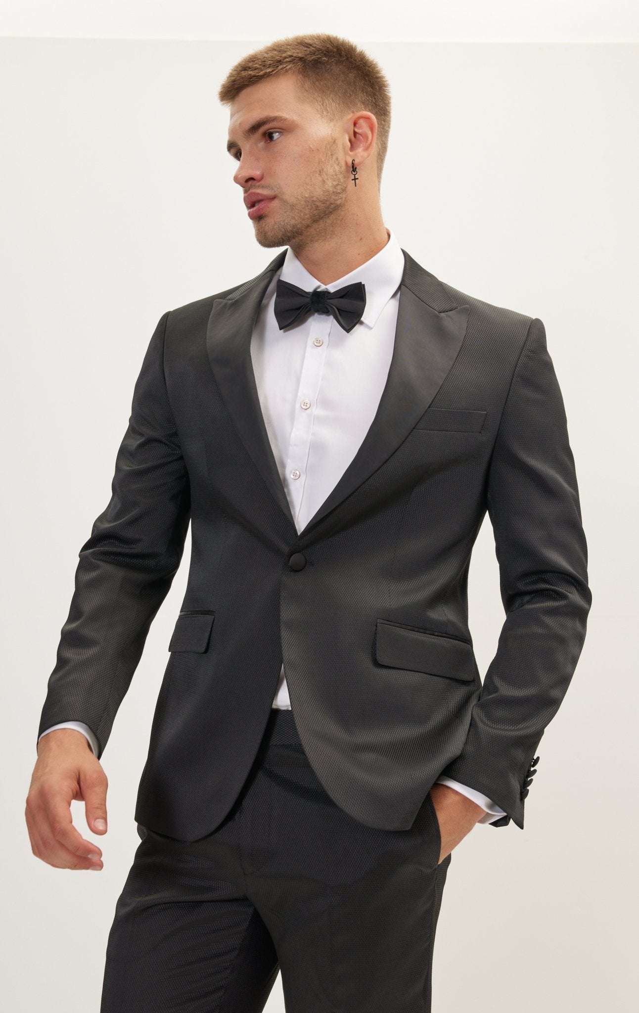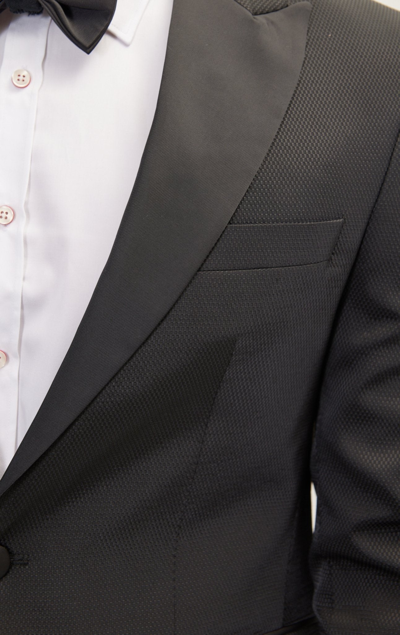 This tailored black and classic tuxedo is a sophisticated choice for any special or formal event. Features a nice textured finish. It also has a tailored fit, which means it is fitted to the wearer's body, giving a clean and polished look.