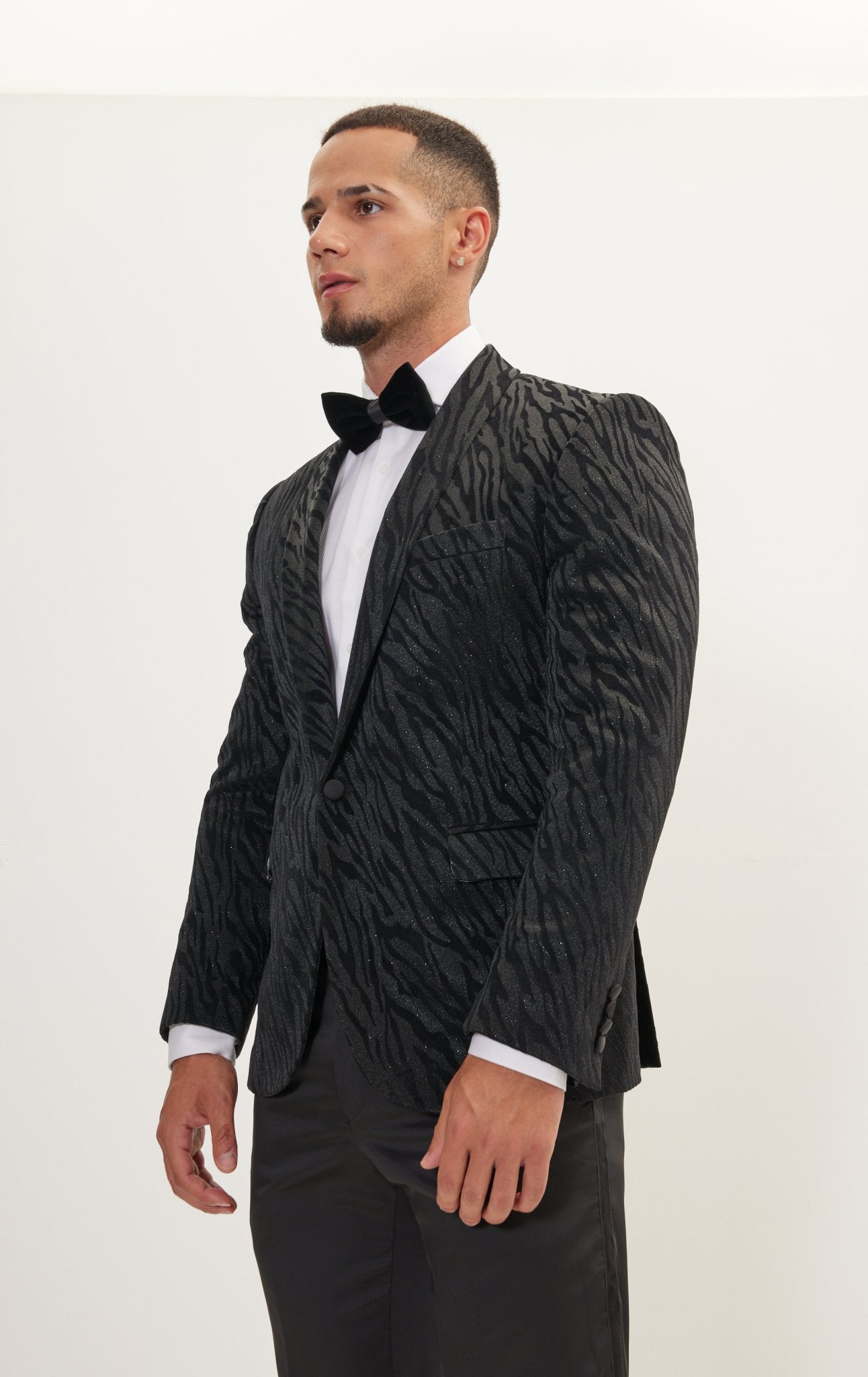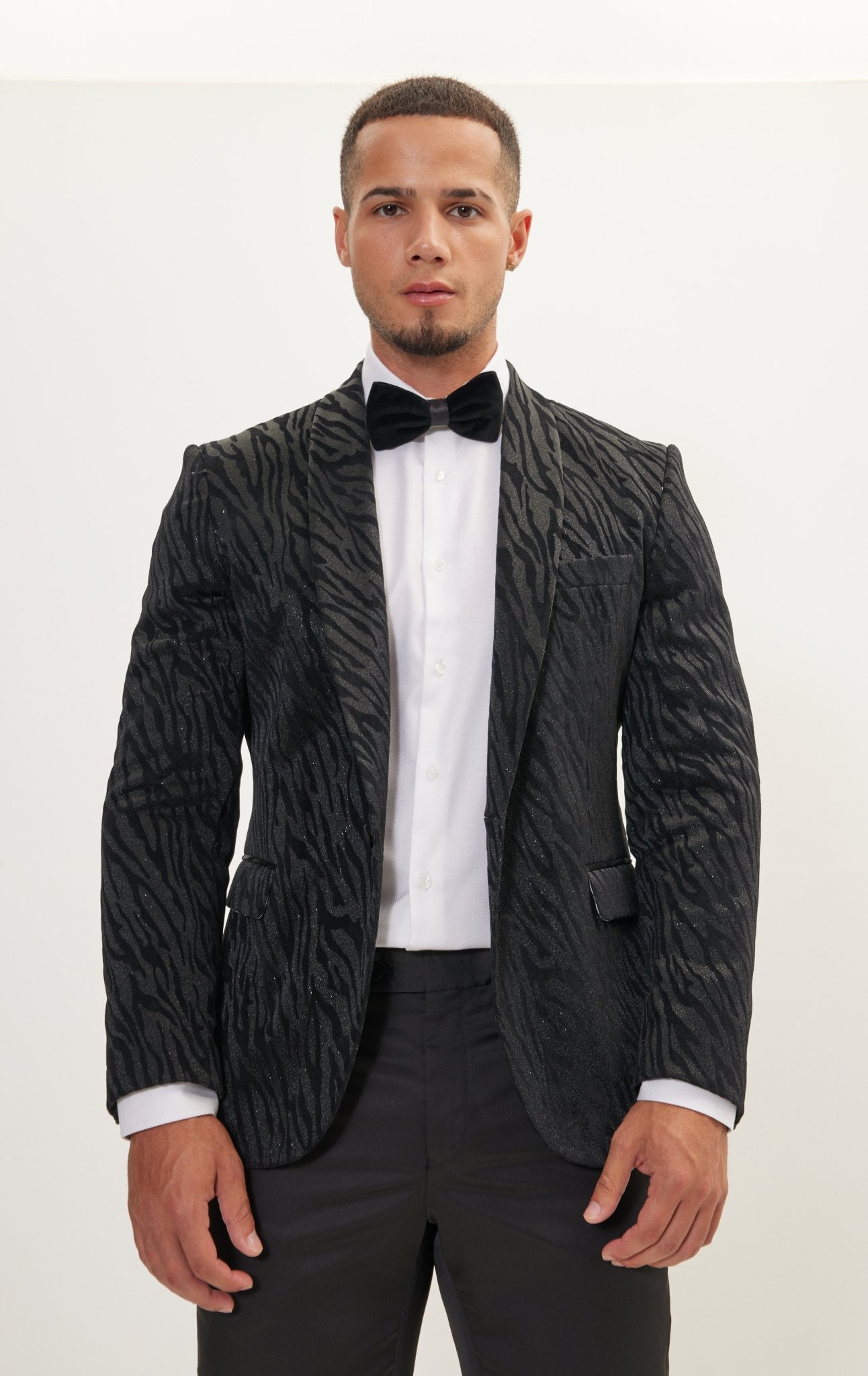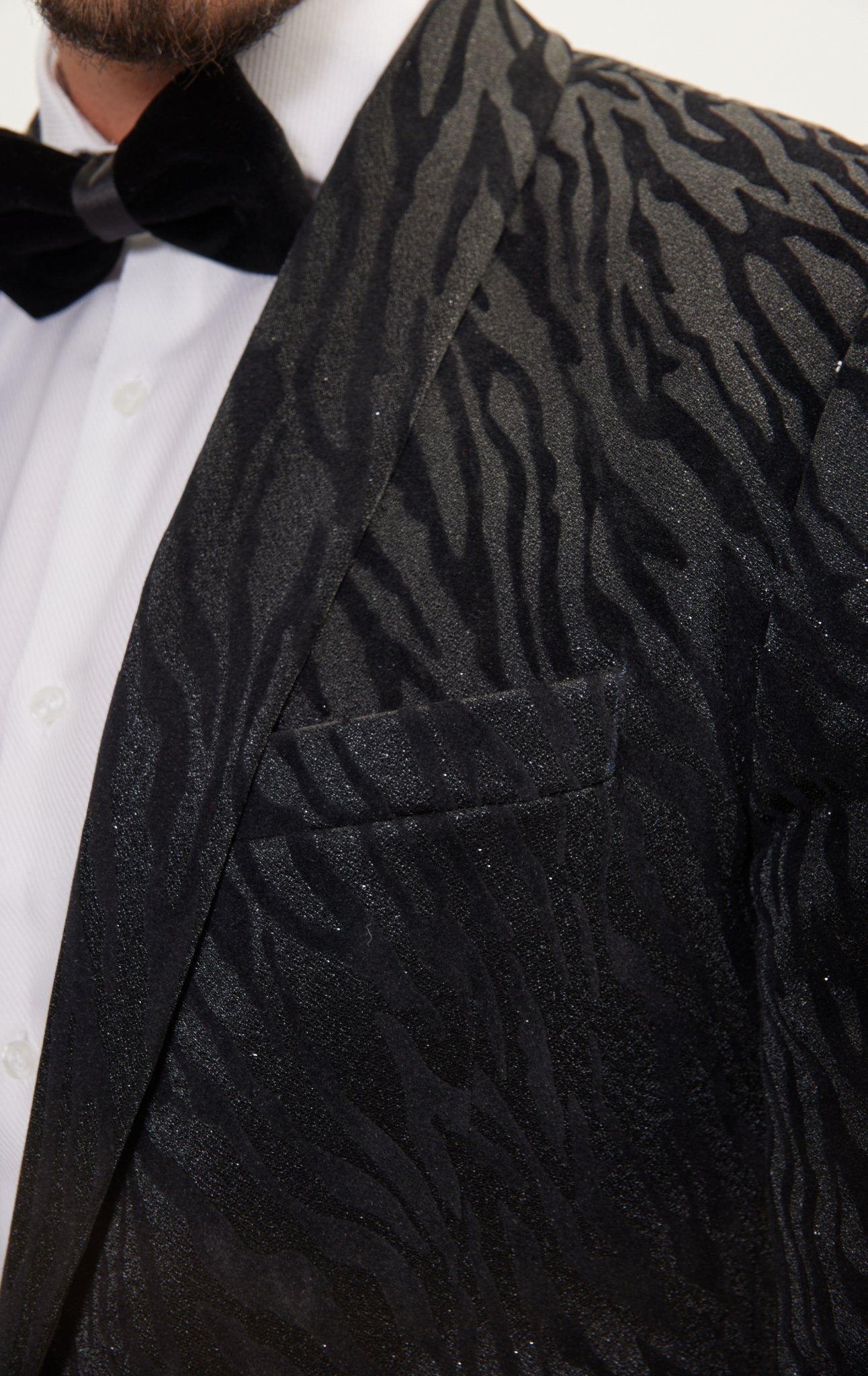 Zebra Velvet Flocking Glittered Tuxedo Jacket - Jet Black